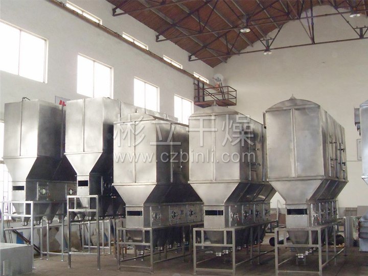 沸腾干燥,又称流化床,它是由空气过滤器、加热器、沸腾床主机,旋风分离器,布袋除尘器、高压离心风机、操作台组成,由于干燥物料的性质不同,配套除尘设备时,可按需要考虑,可同时选择旋风分离器、布袋除尘器,也可选择其中一种,一般来说比重较大的如冲剂及颗粒料干燥只需选择旋风分离器,比重较轻的小颗粒状和粉状物料需配套布袋除尘器,并备有气力送料装置及皮带输送机供选择。